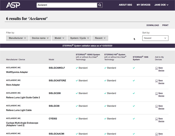 - Use las opciones de filtro para filtrar por Fabricante o por Modelo y Ciclo del Sistema STERRAD™.